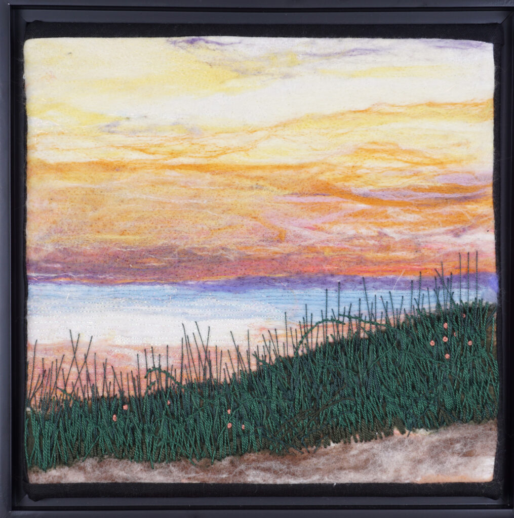 The Felted Landscape by Diane Cadrain Sunday, 9:00 a.m. – 12:00 p.m. with break In this class, participants will use the softest of materials, wool roving, and a special barbed needle, to create an original felted work of art on a backing of raw silk. They will work from an image of a landscape, brought from home (preferably 8 x 10) or provided by the teacher. Suitable for beginners to advanced. This is the third of three sessions offered on this topic.